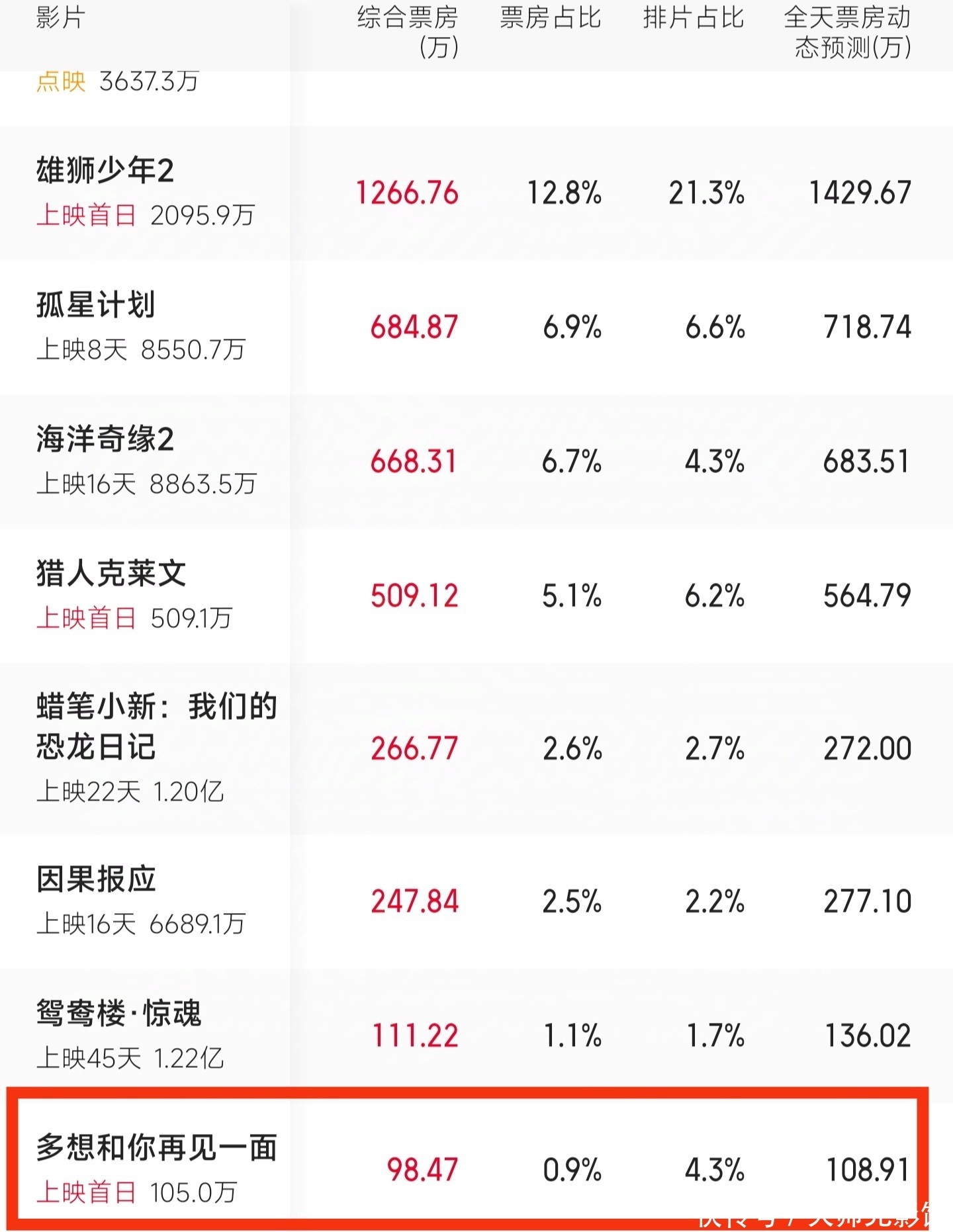但让东说念主没念念到的是影片上映之后票房惨淡,上映首日单日票房唯有100万,累计票房更是唯有105万,如斯宽敞的演员气势却换来这么的票房,属实让东说念主念念不到。