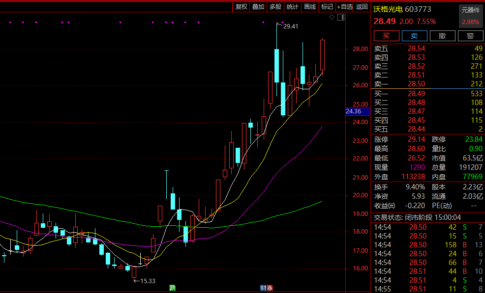 受益Mini LED观念板块走热,沃格光电股价自10月中旬初始显赫高潮。10月14日至11月11日,公司股价累计涨幅为63.55%,从不到18元/股涨至如今的28.49元/股。