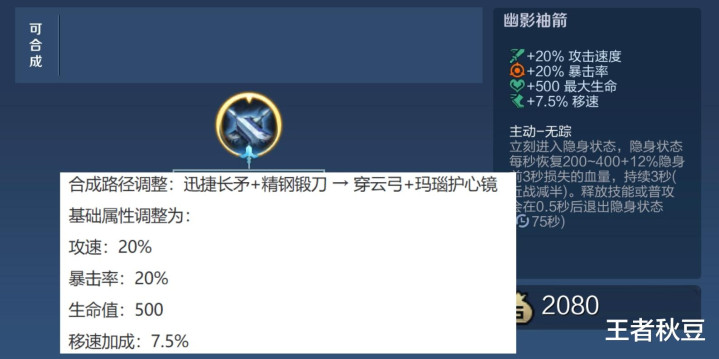 弓手保命装幽影袖箭合成旅途从迅捷长矛+精钢锻刀 → 穿云弓+玛瑙护心镜,移除了35的物理报复和10%的攻速,新增了20%的暴击率。关于弓手来说,幽影袖箭当作保命装王人基本王人是终末一件出。