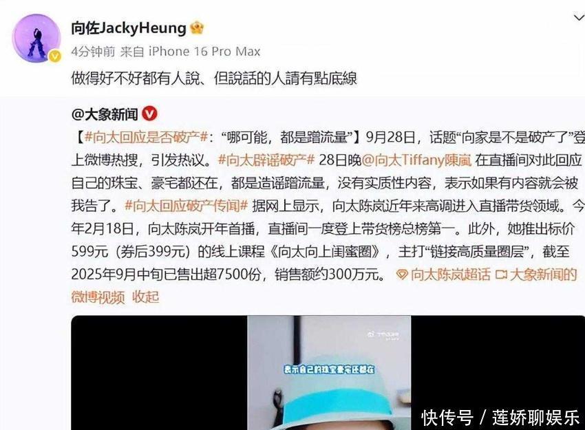 向佐以"讲底线"恢复神话,成果自欺欺人,不仅未能领略事实,反而激勉更多辩论。 影视行业全体低迷,即就是权门向家也不得不调遣战术谋求转型——向太转战直播带货,向佐积极制造话题,中枢认识齐是守护家眷收益。 向太坦言"钱要掰成两半花"一语中的,从当年的糜费品无度到如今的量入为主,折射出行业极冷下的糊口灵巧。 向家此举并非遇到环节危急,而是适宜市集环境主动寻求新的发展旅途。 【免责声明】:本文的时间、经由、图片,东谈主物信息均来自于网罗,著述旨在传播正能量,均无低俗等不良诱导,请不雅众勿对号入座冰球突破九五至尊app娱乐,并飞腾到东谈主身报复等方面。不雅众感性看待身手件,切勿留住主不雅臆断的坏心辩驳,互联网不是法外之地。本文若是真实性存在争议、事件版权或图片侵权问题,请实时研究作家,咱们将赐与删除!