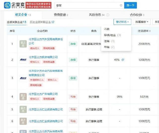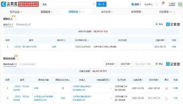 企查查APP披露,本年5月李军被规复现实约6.59亿,限高案件涉案总金额约6.64亿。此外,李军计较关联北京亚之杰汽车买卖有限连累公司、北京亚之杰投资有限公司、北京亚之杰合众汽车销售处事有限连累公司等10余家企业。其中冰球突破九五至尊app(中国)官方网站,北京亚之杰告白有限公司、北京亚之杰汇达投资有限公司等多家公司已被拆除。