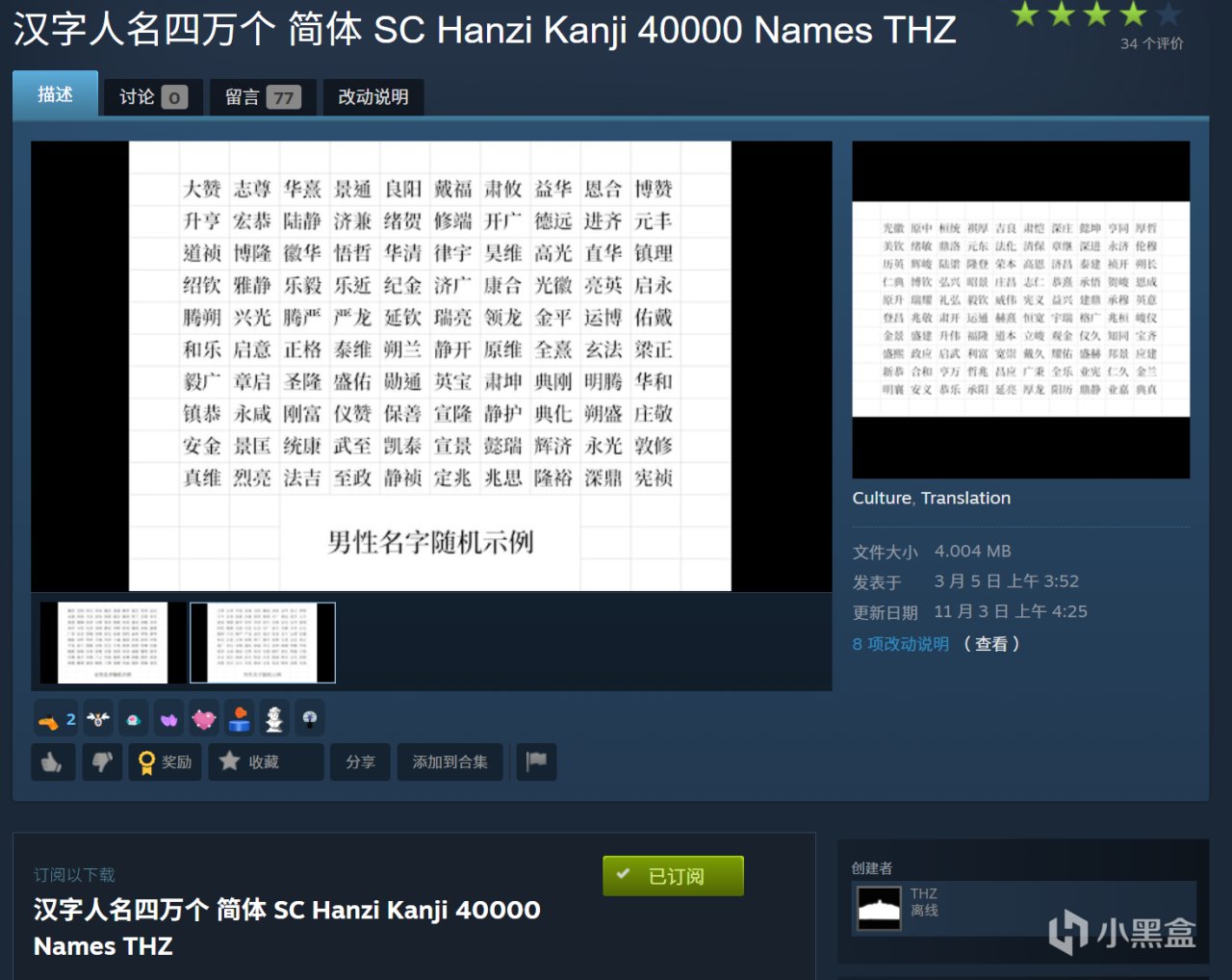 9.汉字东谈主名四万个 简体 SC Hanzi Kanji 40000 Names THZ如表格,本作整合了,「中国东谈主名」(by blue0china 之作)、「汉东谈主名字大拓展」(by木火门户 之作) 两套东谈主名进来,以及2025年溥天之下DLC官方新版。 男名我新增了39800个个东谈主名,是以狡计共有46865个东谈主名。 女名我增多了34200个东谈主名,是以狡计共有36393个东谈主名。 姓氏最终共722个。含百家姓。