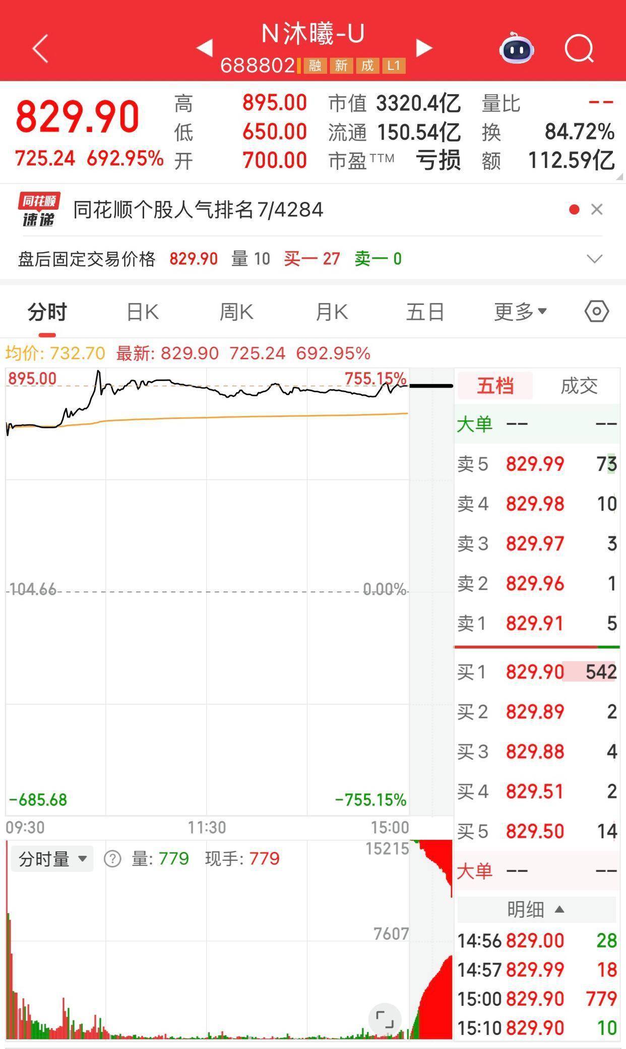 斥逐收盘,沐曦股份最上升至895元/股,暴涨755.15%。若按此价钱缠绵,那么中签股民最高盈利面临40万元。