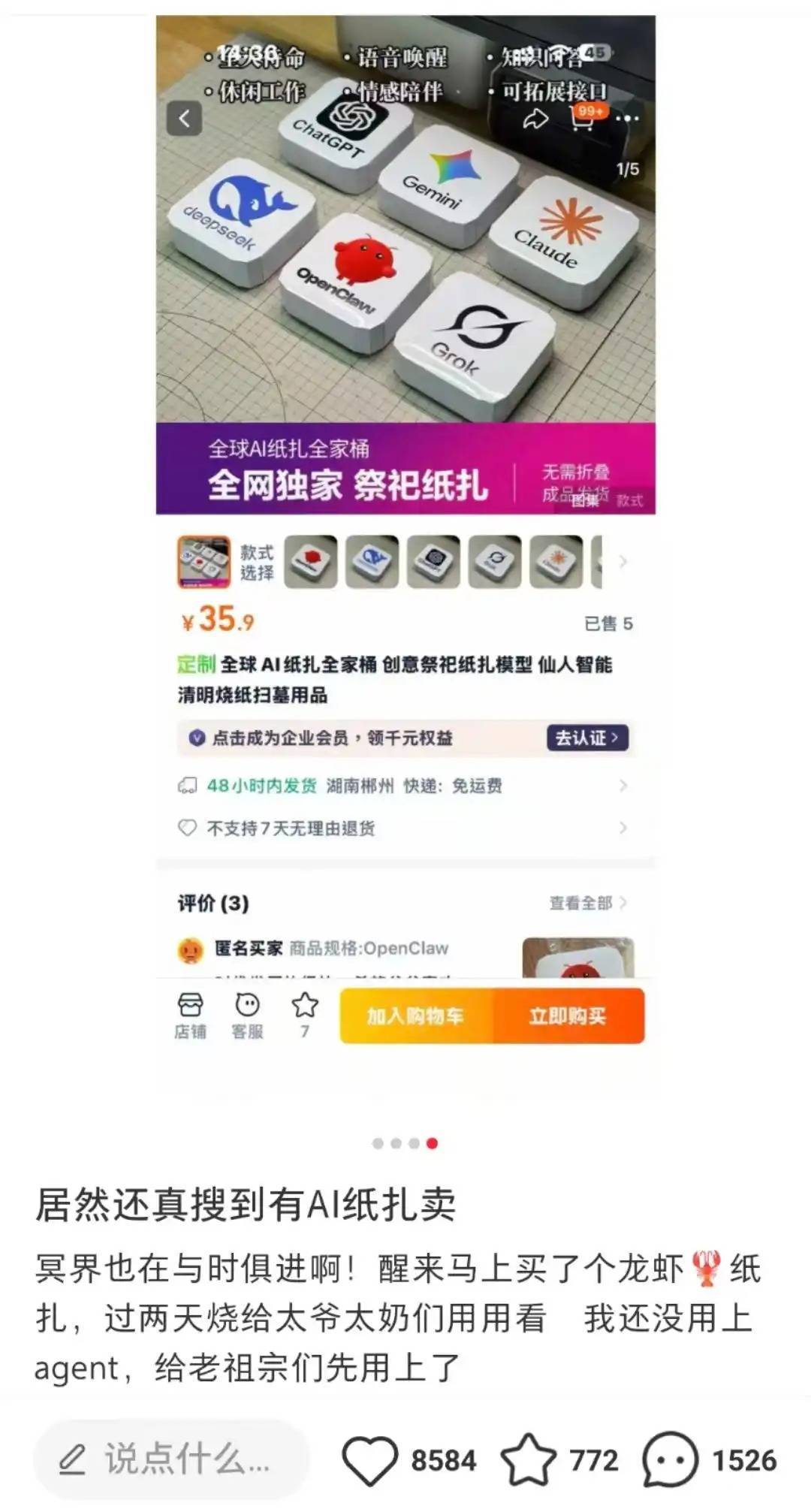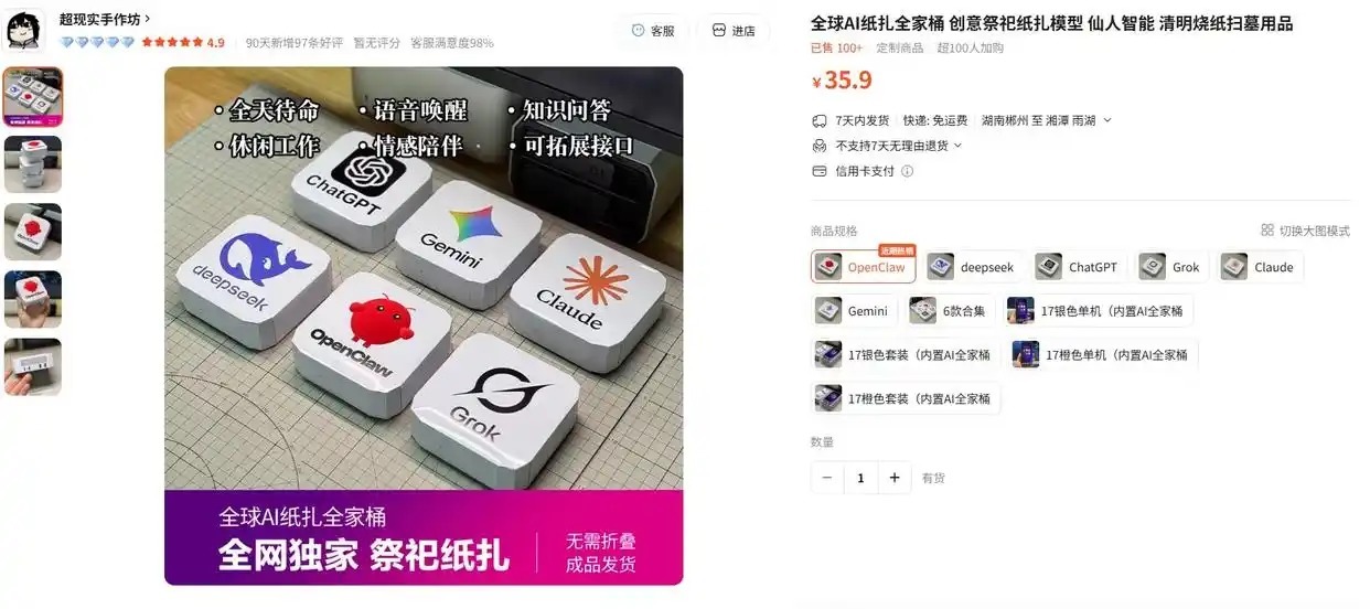 近日,有网友共享,在电商平台看见湖南郴州一商家售卖纸扎的“deepseek”“龙虾”等软件祭品,它们王人是印有这些软件log的纸盒子,单价从35元到近100元不等,平台深切已售100+。对此,好多网友簸弄:直爽烧纸“真卷”、AI的风吹到了阴间、祖宗能用澄澈吗……